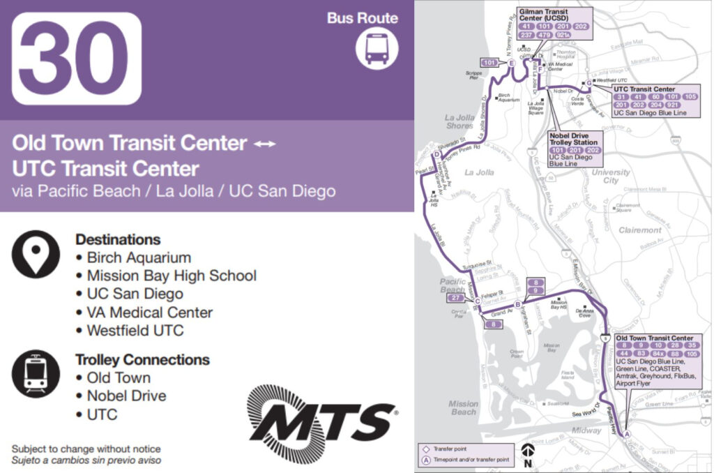 Route 30 is one of the most frequent north-south routes in San Diego, running every 15 minutes most of the day. It connects:
