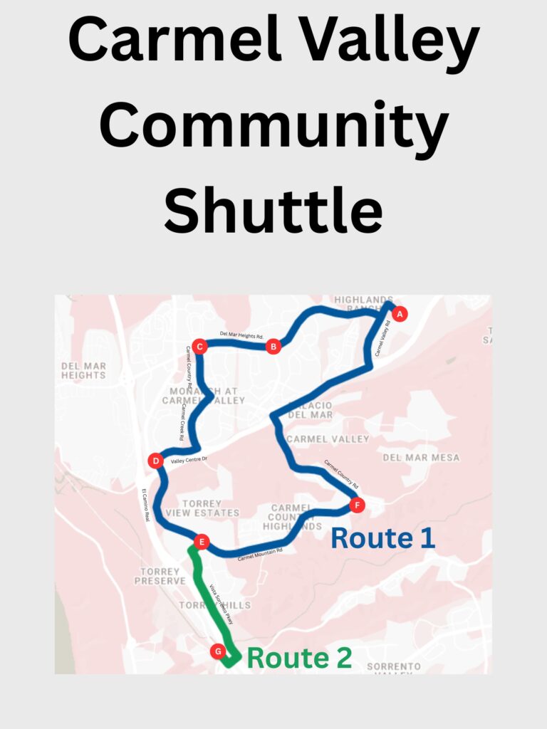 Bidirectional loop route serving the main areas of Carmel Valley, Pacific Highlands Ranch. and Carmel Country Highlands. The stops would be request-only. Points of interest include: PHR Village, Del Mar Highlands/One Paseo, Plazza Carmel, El Camino Real Offices, Torrey Hills Center, and Neurocrine Biosciences. It would run every 20 minutes during peak hour only or could run a reduced schedule during the off hour.